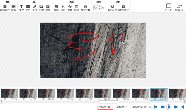 5、如果你对这个GIF不太满意,想要进行一些编辑操作的话也可以。在界面的上方有很多编辑工具,要添加文字、图片,旋转、裁剪图片、缩放、延时等都能轻松实现。