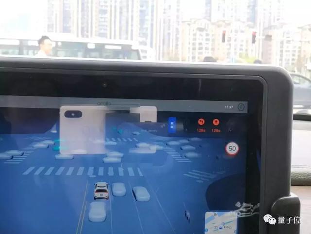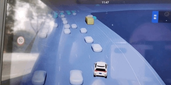 之后,车辆可以自行变道,变道的轨迹也会显示在车辆前面和后排的屏幕上。