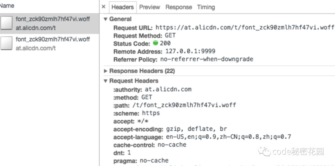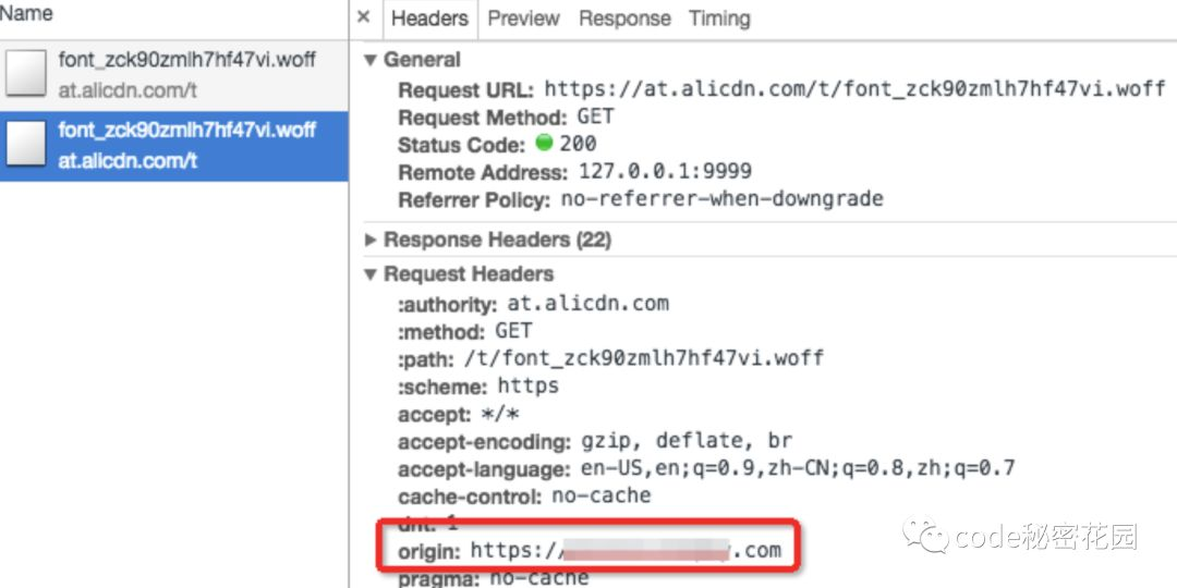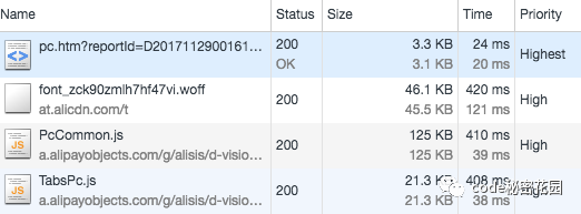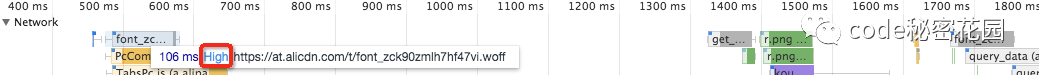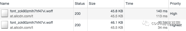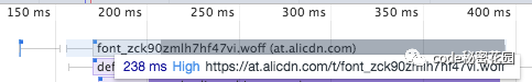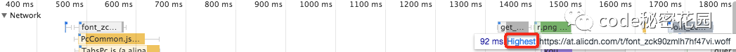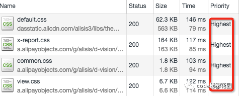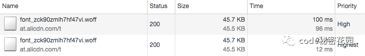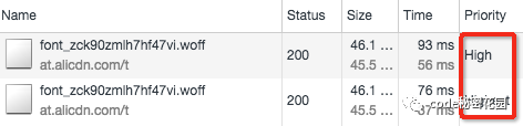 样式文件中有一个 @font-face 依赖一个 font 文件,样式文件中依赖的字体文件加载的优先级是 Highest;在使用 preload 预加载这个 font 文件时,若不指定 crossorigin 属性(即使同源),则会采用匿名模式的 CORS 去加载,优先级是 High,看下图对比:第一条 High 优先级也就是 preload 的请求: