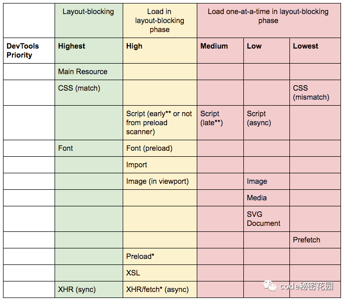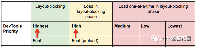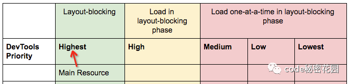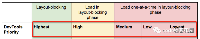 这张图表示的是,在 Chrome 46 以后的版本中,不同的资源在浏览器渲染的不同阶段进行加载的优先级。在这里,我们只需要关注 DevTools Priority 体现的优先级,一共分成五个级别: