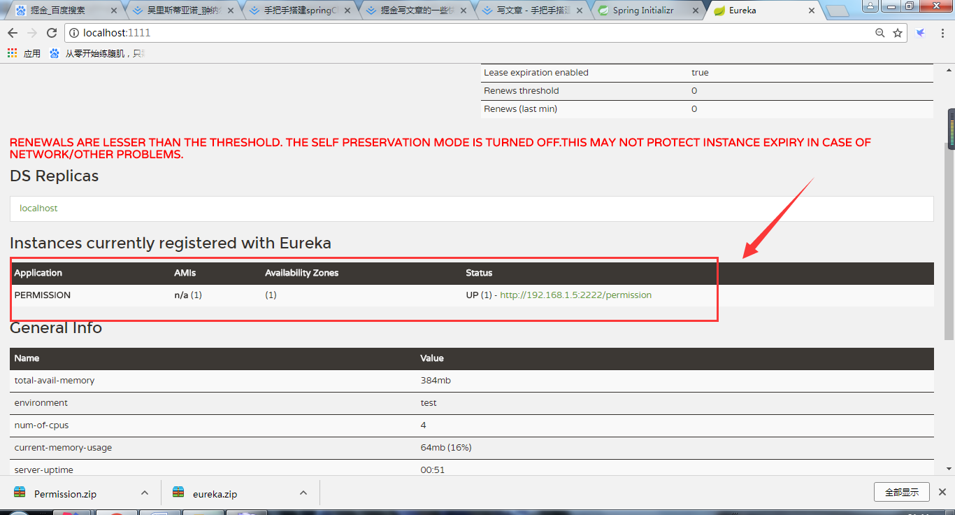 打开网页,输入网址:localhost:1111(ps:这个eureka服务端是上一篇文章建立的,先讲eureka服务端启动,再来启动我们刚刚创建的eureka客户端)