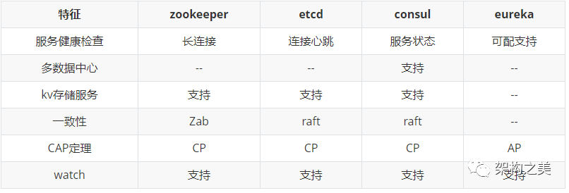 从功能上看,满足注册中心功能需求可以作为技术选型的开源产品有很多,常见的选型对比如下表: