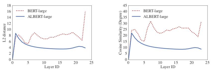 作者对比了每层输入输出的L2距离和相似度,发现了BERT的结果比较震荡,而ALBERT就很稳定,可见ALBERT有稳定网络参数的作用。