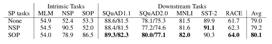 后BERT时代很多研究(XLNet、RoBERTa)都发现next sentence prediction没什么用处,所以作者也审视了一下这个问题,认为NSP之所以没用是因为这个任务不仅包含了句间关系预测,也包含了主题预测,而主题预测显然更简单些(比如一句话来自新闻财经,一句话来自文学小说),模型会倾向于通过主题的关联去预测。因此换成了SOP(sentence order prediction),预测两句话有没有被交换过顺序。实验显示新增的任务有1个点的提升: