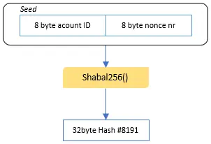 1.Nonce文件的种子由Account Id(即BurstCoin网络中的用户地址或者用户Id) 与Nonce Id(即nonce编号)组成,经过第一次Hash,生成Hash #8191,即Non中的编号为8191的Hash值。