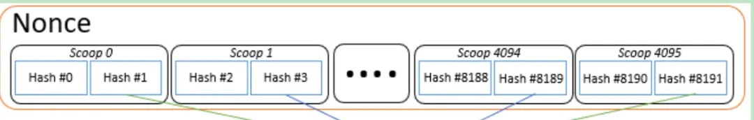 - Scoop:每个Nonce文件由4096个Scoop文件构成,同样拥有编号,其编号范围为0-4095。而每个Scoop文件包含2个Hash值,也即一个Nonce文件包含8192个Hash值。