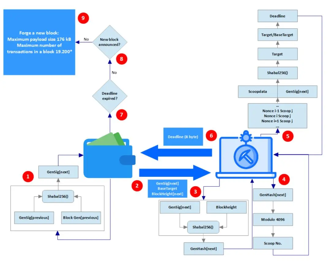 deadline:是一个整数类型数值,一个拥有特定deadline的区块,在全网中需要等待对应于该deadline所指定的时间之后,才可以被作为一个合法的区块。举例来说,如果deadline为60,则代表在上一个块出块时间一分钟后,这个块可以被允许添加到主网作为合法区块。由此我们可以得知,计算得出deadline越小的矿工,越有胜算得到当前块的铸造权。而deadline的计算过程是矿工通过遍历自己所有随机生成的Nonce中的值计算得出,也即代表所拥有Nonce个数越多,磁盘占用空间越大,获取数值更低的deadline的概率更大,从而得到铸块权的概率也更大。