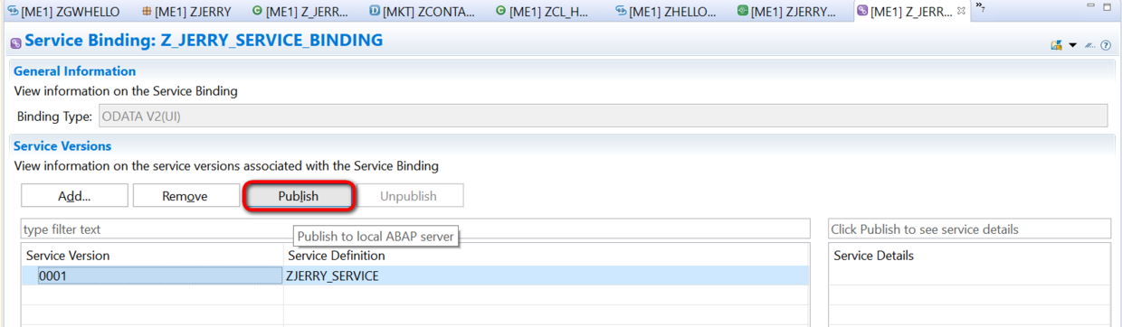 注意下图右边的Service Details标签页里,此时是空的。点击Publish按钮: