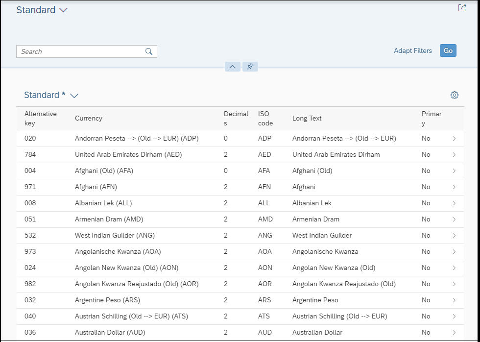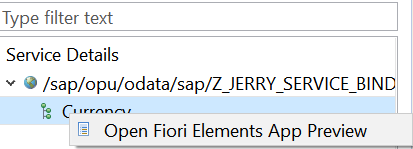 对这个Currency Entity点右键,选择Open Fiori Elements App Preview,就能在预览模式下通过一个标准通用的Fiori Elements应用把当前系统上I_Currency里的数据显示出来: