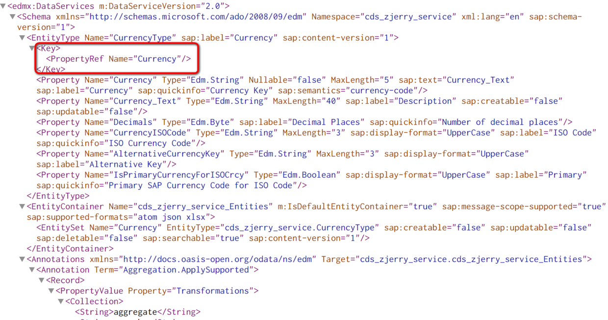 点击这个Service URL超链接,也能直接打开对应OData服务的元数据(metadata)链接: