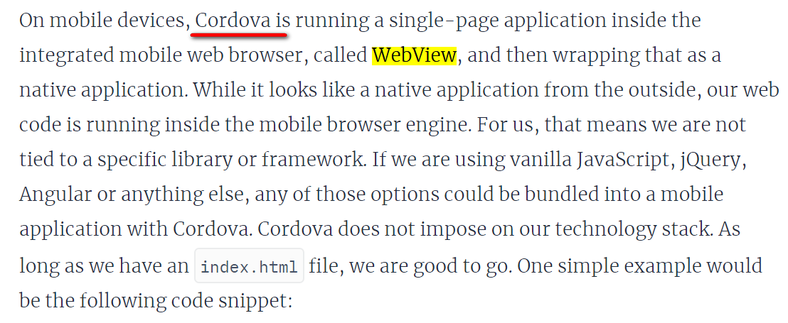 去年Jerry的C4C开发团队同事,Yang Joey曾经写过一篇文章:SAP移动应用解决方案之一:HTML5应用 + Cordova = 平台相关的混合应用,介绍了SAP Cloud for Customer的移动端应用是怎么基于开源项目Cordova创建的,当时文章曾经提及,使用Cordova打包成的移动应用,实际上运行在移动平台的WebView里。而React-Native则有着和Cordova完全不同的设计理念。