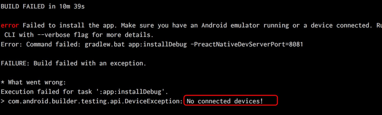 这报错信息很清楚,React-Native cli不知道应该将打好包的应用安装在什么地方。解决方法也很容易,要么启动一个Android模拟器,要么用USB连接真机。