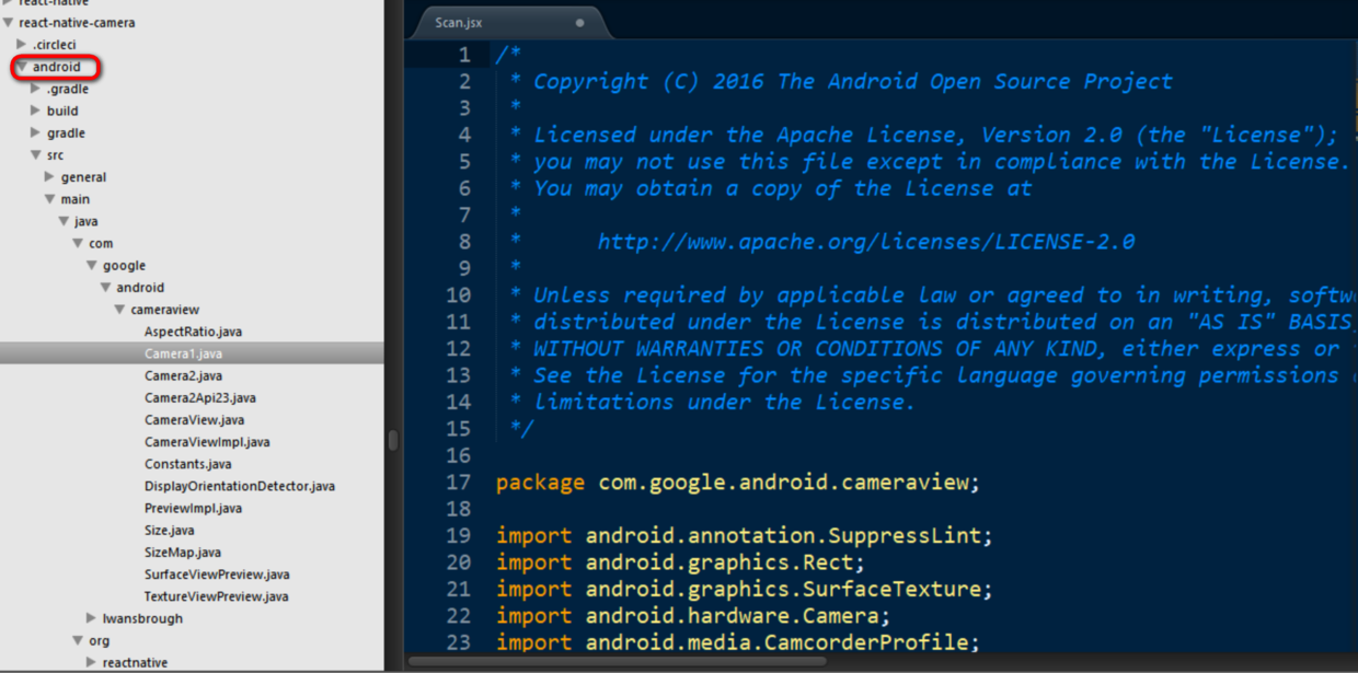到React-Native应用文件夹node_modules下查看RNCamera的实现,发现果然是根据移动操作系统的类型分别作了处理。如果是Android平台,使用摄像头对应的权限为:PermissionsAndroid.PERMISSIONS.CAMERA