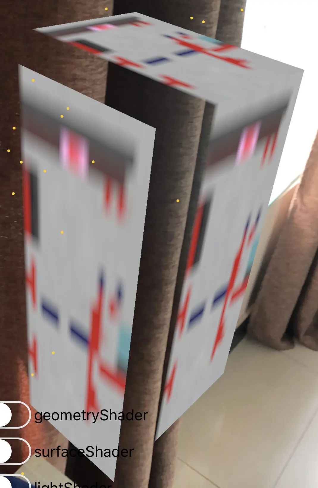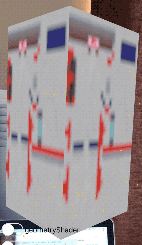 这样子,但是 SCNNode 类型支持的贴图有很多种,官方文档中说明中主要有:UIColor,UIImage, CALayer,NSURL,SKScene,SKTexture...甚至还支持AVCaptureDevice相机和AVPlayer播放视频。