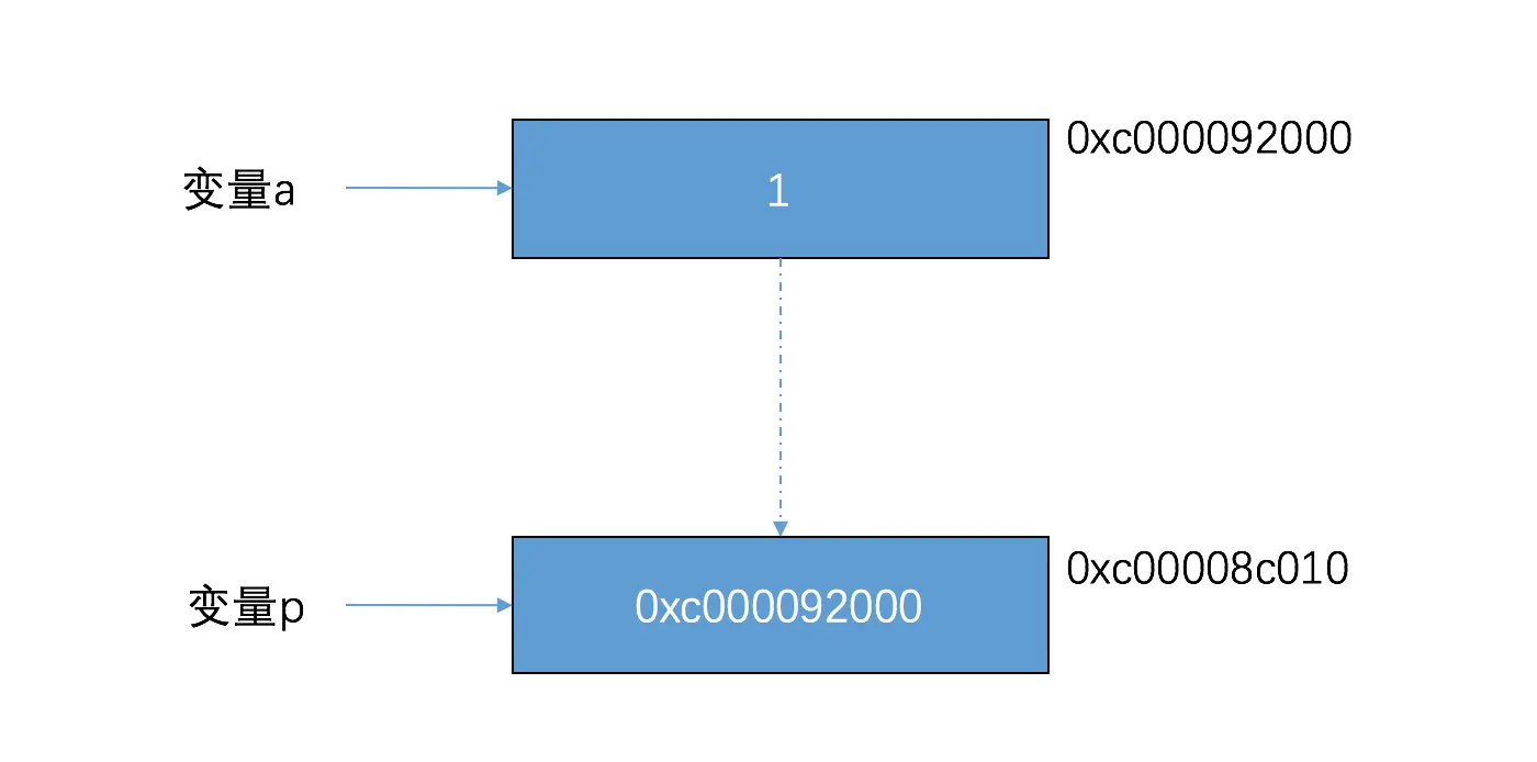 我这里的输出结果是,变量 a 和 p 的地址分别为 0xc000092000 和 0xc00008c010。此时的内存的分布如下: