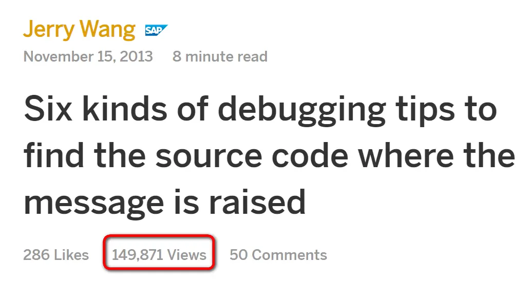 Jerry在SAP社区上写了600多篇博客,阅读量最高的大概要算下面这篇写于2013年的文章:Six kinds of debugging tips to find the source code where the message is raised