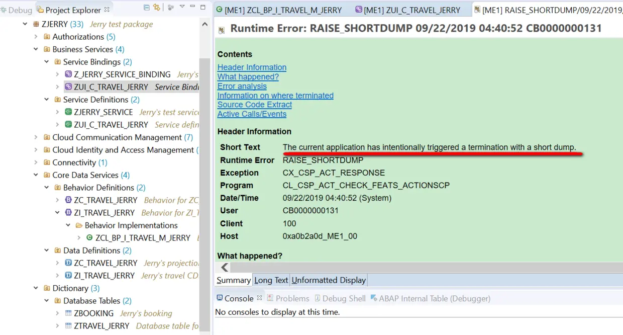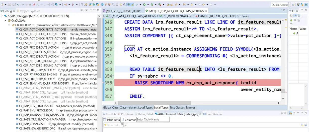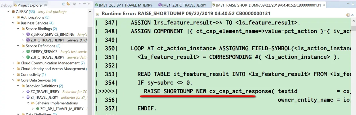 回到ABAP Development Tool里,我们先点击Show超链接,就可以看到运行时错误明细:Short Text告诉我们,我们点击Accept按钮后,相关的处理框架有意地抛出一个CX_CSP_ACT_RESPONSE的异常。抛出异常的位置是在程序CL_CSP_ACT_CHECK_FEATS_ACTIONS里,这暗示我们,这个错可能和Action执行前的检查(CHECK)有关。