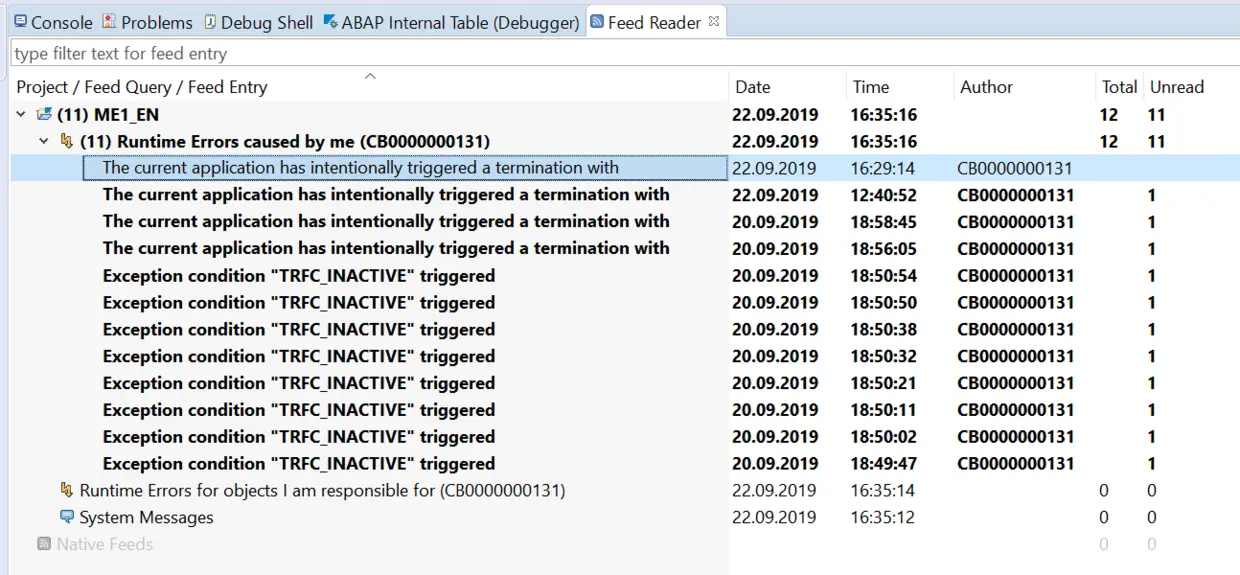 在SAP Cloud Platform ABAP环境下当前登录用户发生的所有运行时错误,可以在ABAP Development Tool的Feed Reader视图下查看,这个功能相当于SAP GUI里的ST22事务码。