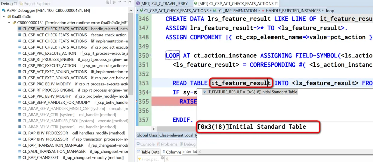 把鼠标放在it_feature_result上,发现这个内表是空的,当然无法从里面读出数据了。这个内表是当前ABAP类CL_CSP_ACT_CHECK_FEATS_ACTIONS的方法handle_rejected_instances的输入参数,需要搞清楚为啥这个输入参数为空。