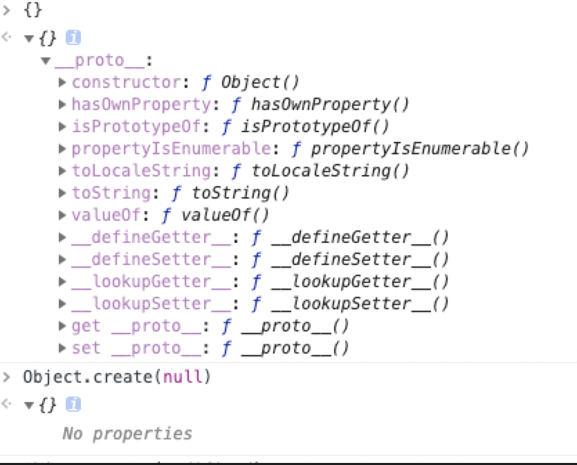 Object.crete(null)会返回一个纯净的对象,不会继承内置Object的toString、valueof等方法。