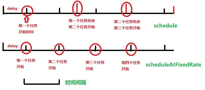 scheduleAtFixedRate:如果第一次执行时间被delay了,随后的执行时间按上一次开始的时间进行计算,并且为了赶上进度会多次执行任务,因此TimerTask中的执行体需要考虑同步。