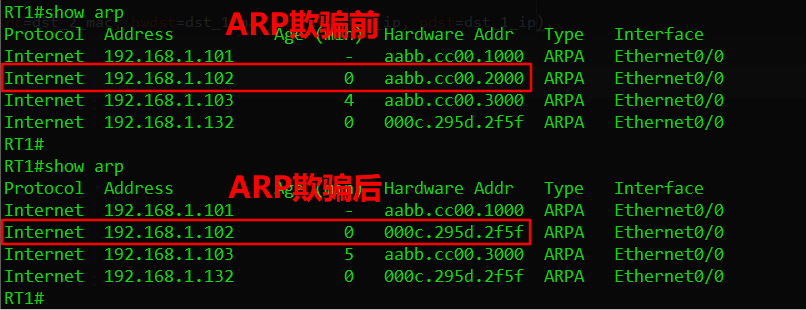# 欺骗192.168.1.101,让它认为192.168.1.102的MAC地址为本机攻击者的MAC