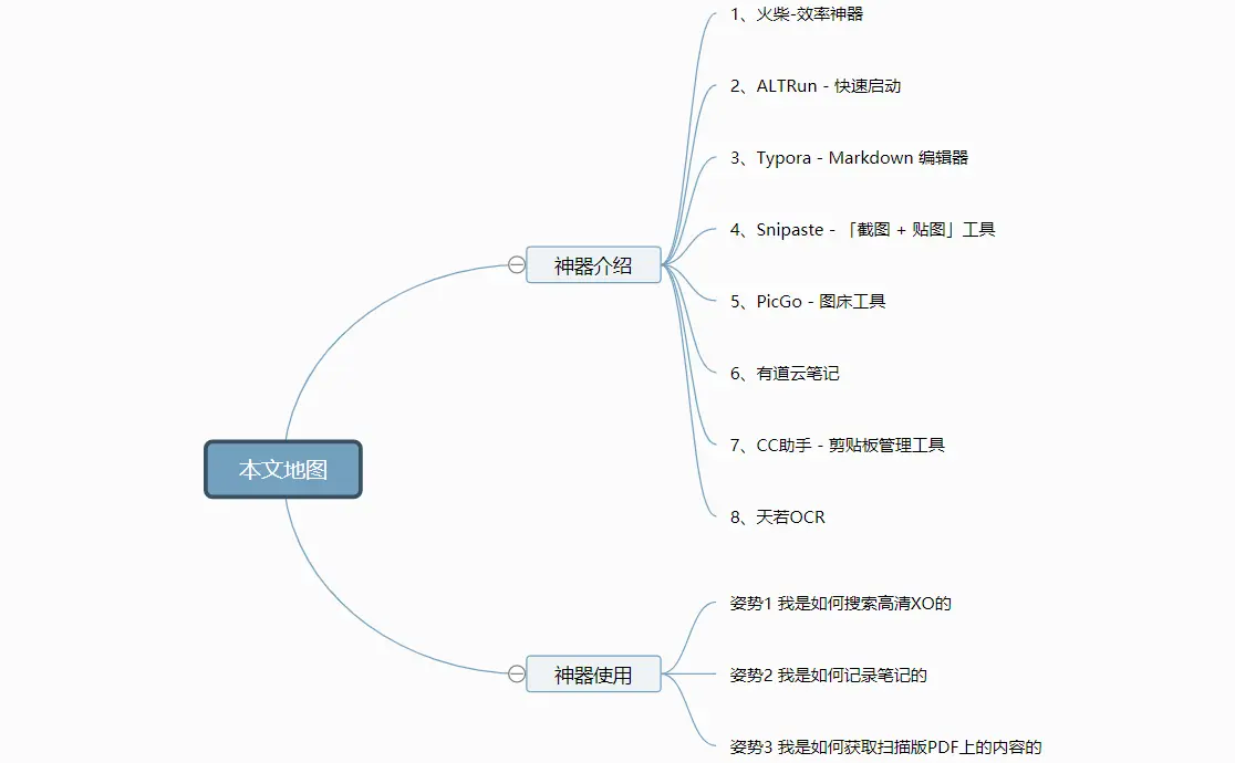 今天周六了,分享几款我目前在用的小工具,希望对你有用。使用工具的好处等等,我就不过多介绍了,下面文章的内容是先简单介绍这几款工具,然后说明一下我是怎么应用的。简单的一个思维导图,看下本文全貌: