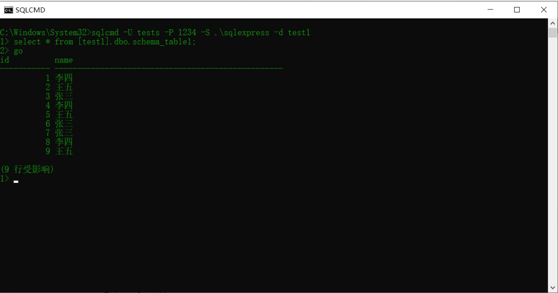 2、输入命令:sqlcmd -U tests -P 1234 -S .\sqlexpress -d test1