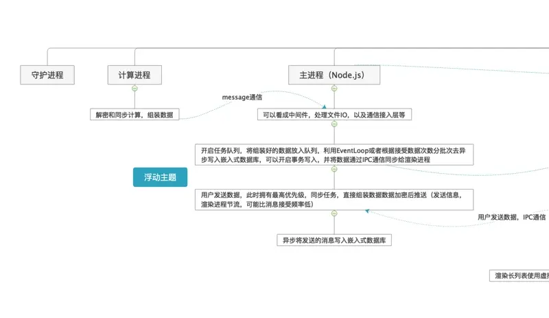 这款应用的核心竞争力,是20万人超级群,那么数据量很大,大批量渲染压力和频繁加解密计算耗时、频繁数据库写入压力都是不可避免的,那么我们的Node.js擅长异步非阻塞,以及前端渲染进程的异步就显得尤为重要