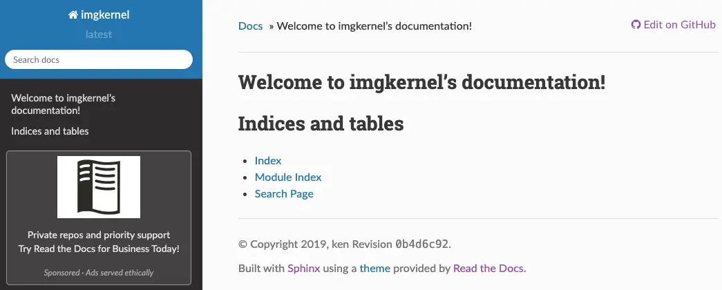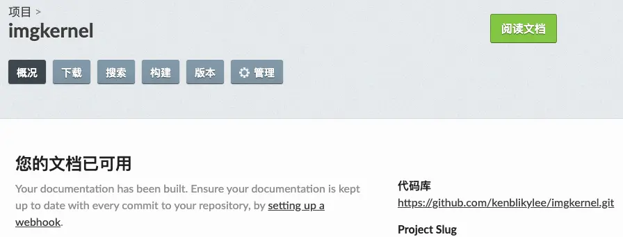 浏览器打开 "Read the Docs" 网站 readthedocs.org 。使用 GitHub 账号授权登陆。"Read the Docs" 会自动同步 GitHub 所有项目,并以列表显示出来,选择项目 imgkernel ,点击右边的按钮 ➕ ,导入项目。