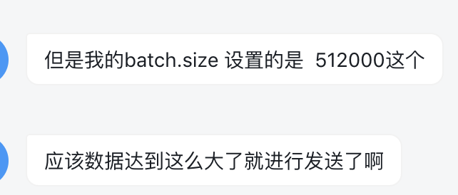 然后接下来他跟我讲他已经在客户端配置了 batch.size 的值为 512000,按照这个值的作用,应该是大于这个值才会进行批量发送消息到 broker: