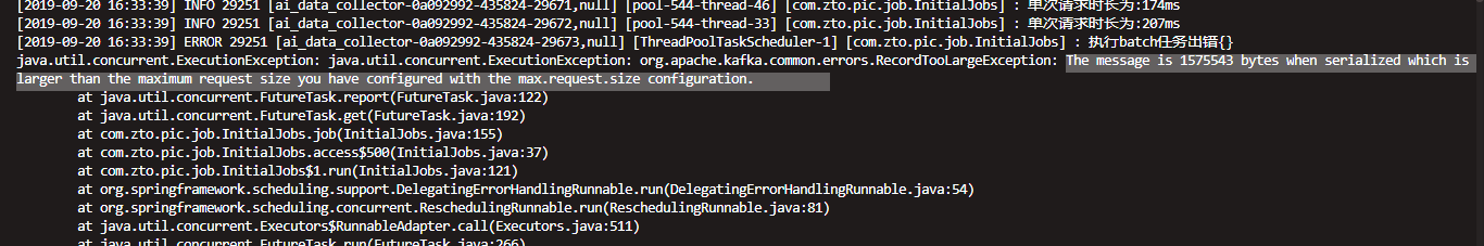// 确保消息大小不超过发送请求最大值 max.request.size,或者发送缓冲池发小 buffer.memory