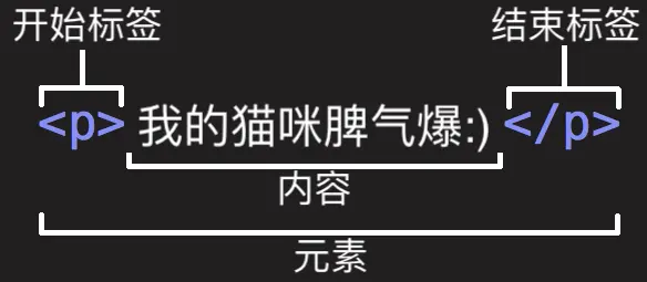- 开始标签(Opening tag):包含元素的名称(本例为 p),被大于号、小于号所包围。表示元素从这里开始或者开始起作用 —— 在本例中即段落由此开始。