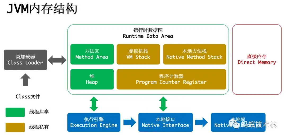 -程序在执行之前先要把 Java 代码转换成字节码文件(class 文件),JVM 首先需要把字节码通过一定的方式 类加载器(ClassLoader )把文件加载到内存中 运行时数据区(Runtime Data Area ),而字节码文件是 JVM 的一套指定集规范,并不能直接交给底层操作系统去执行,因此需要特定的命令解析器 执行引擎(Execution Engine )将字节码翻译成底层系统指令再交由 CPU 去执行,而这个过程需要调用其他语言的接口 本地库接口(Native interface )来实现整个程序的功能