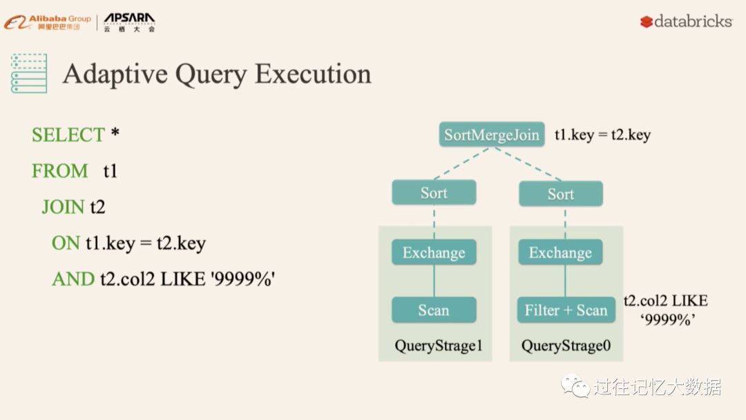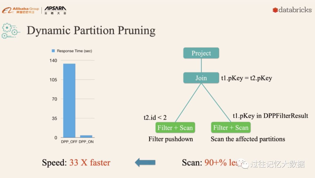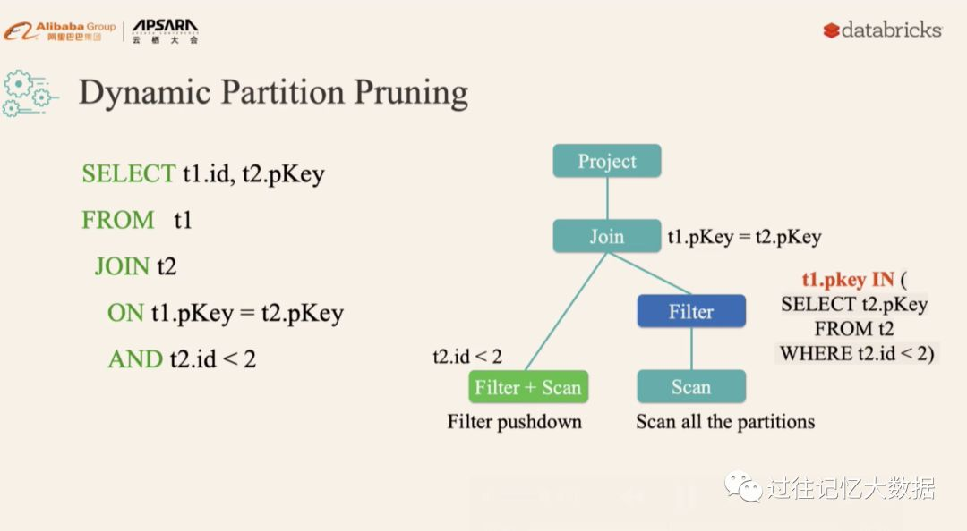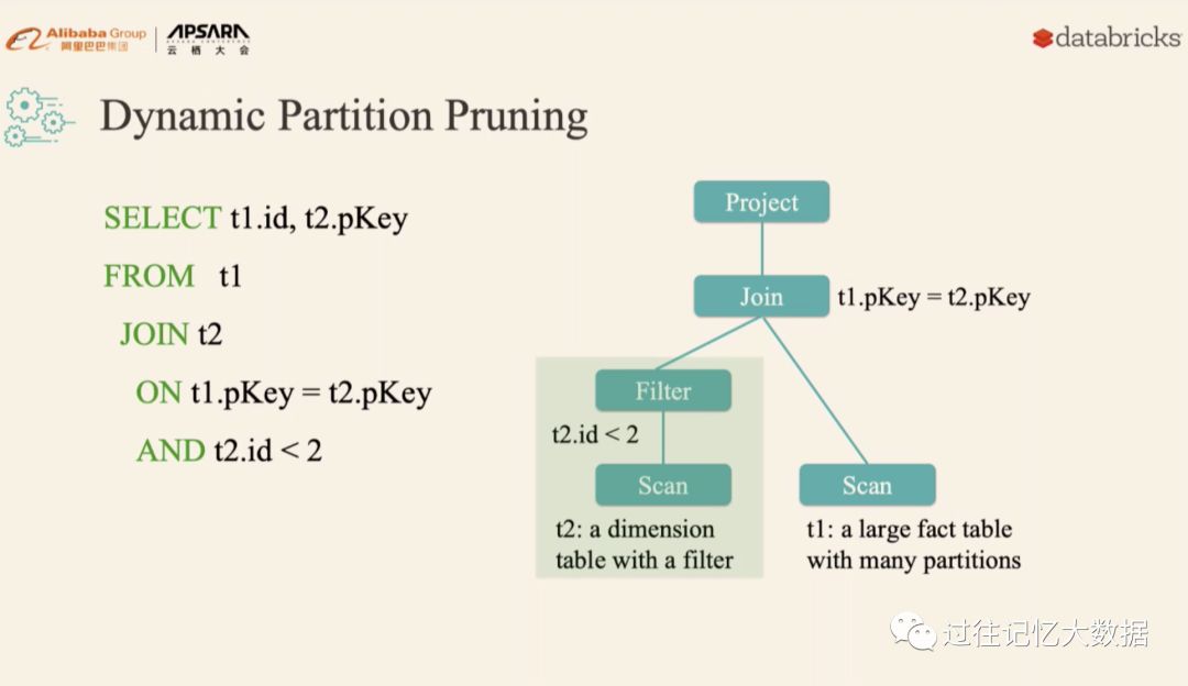 比如上面的 SQL 查询,假设 t2 表 t2.id < 2 过滤出来的数据比较少,但是由于之前版本的 Spark 无法进行动态计算代价,所以可能会导致 t1 表扫描出大量无效的数据。有了动 态分区裁减,可以在运行的时候过滤掉 t1 表无用的数据