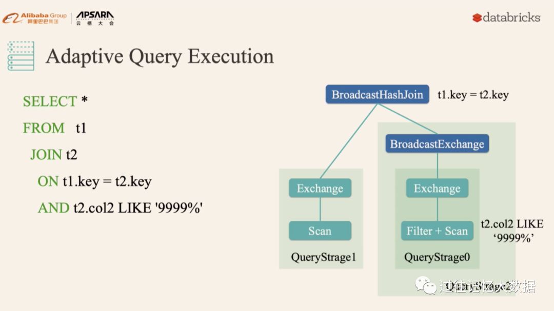 而有了 AE 之后,Spark 就可以动态统计相关信息,并动态调整执行计划,比如把 SortMergeJoin 变成 BroadcastHashJoin: