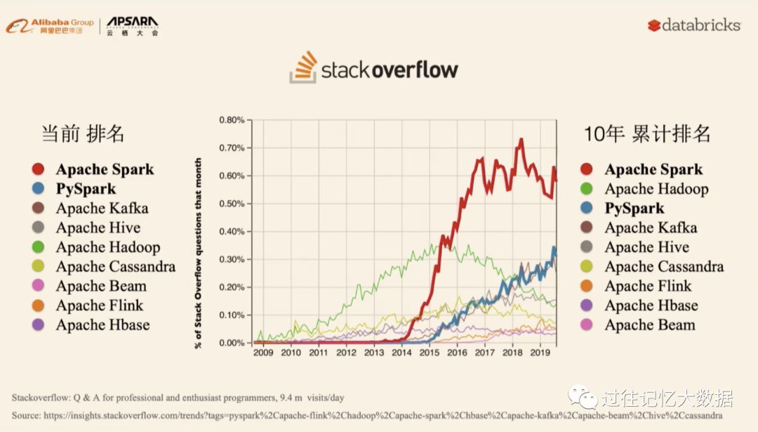 世界级的知乎 stackoverflow 中当年 Spark 和 PySpark 排名都很靠前,10年累计排名 Apache Spark 第一,Apache Hadoop 第二;未来 Apache Spark 和 PySpark 将会垄断世界。