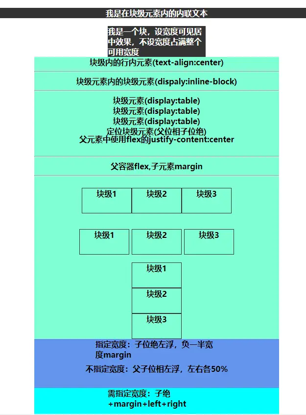.block { width: 200px; margin: 0 auto; background-color: aquamarine;}<div class="block">我是一个块,设宽度可见居中效果,不设宽度占满整个可用宽度</div>(2)父级为块级元素的块级元素水平居中