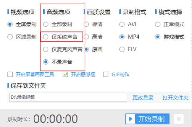 3、而在音频选项中正好有录制全部声音、仅录制系统声音、仅录制麦克风声音和不录声音这四个选项。由于我们是要录制系统声音、所有选择第二个仅录制系统声音。