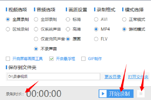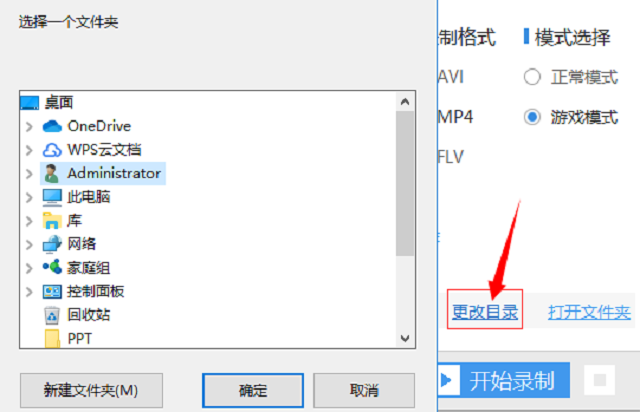 4、选择好了之后可以录制一个视频检验一下,但在录制之前要先选好视频保存的路径,你可以点击“更改目录”来选择你喜欢或者觉得合适的文件路劲。