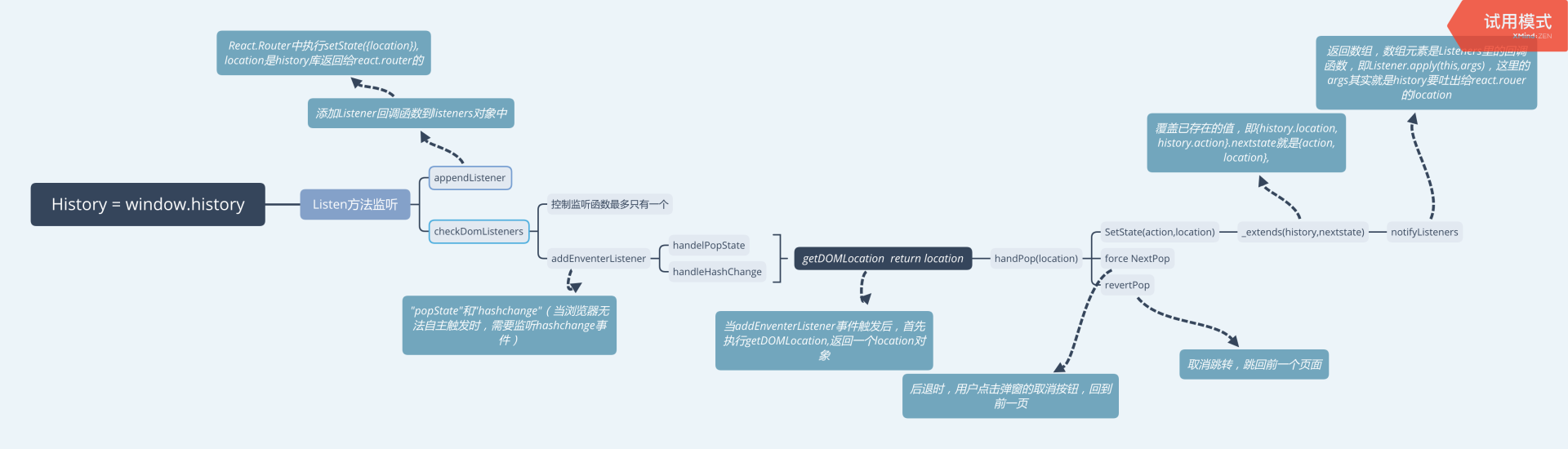 但是这里没有很明白一点:在listen这部分有一块注释,意思是当组件mount之前,如果发生了popstate、hashchange事件,那我可以及时的在mount之前就利用_this._pendingLocation = location;那样在componentDidmount的时候就可以用最新的location进行渲染。我是这么理解的,不敢确认一定正确。??????