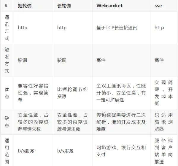 服务器推送技术不止一种,有短轮询、长轮询、WebSocket、Server-sent Events(SSE)等,他们各有优缺点: