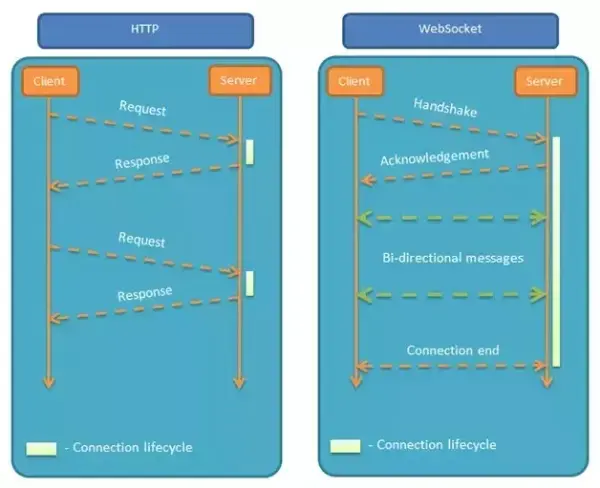 - WebSocket是纯事件驱动的,一旦连接建立,通过监听事件可以处理到来的数据和改变的连接状态,数据都以帧序列的形式传输。服务端发送数据后,消息和事件会异步到达。