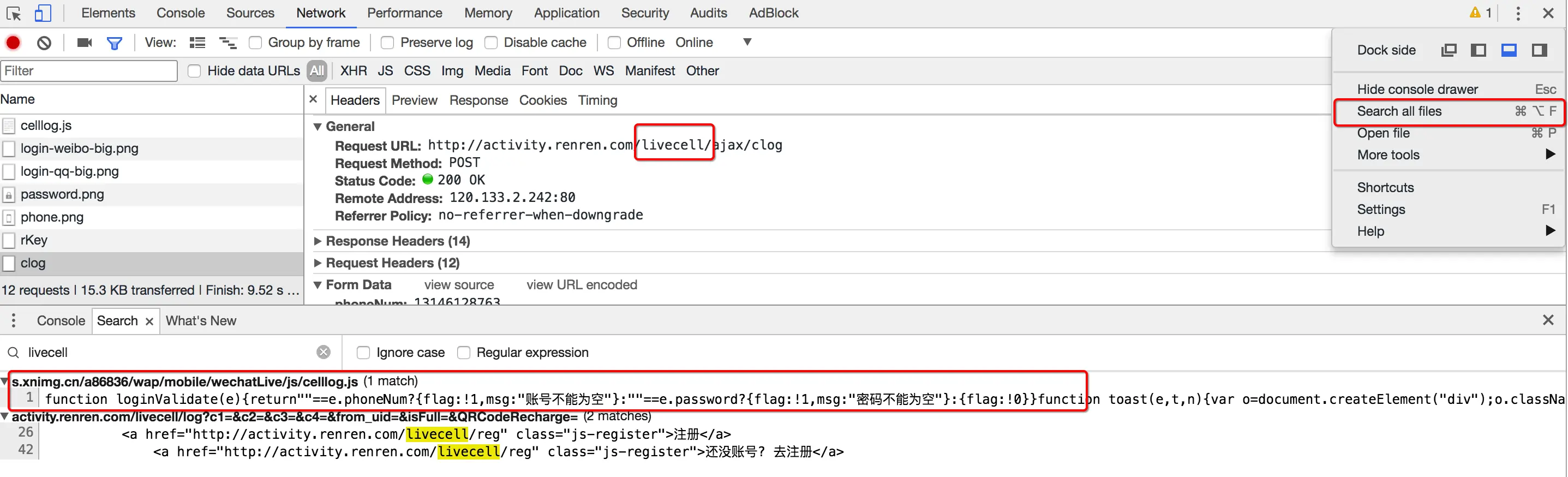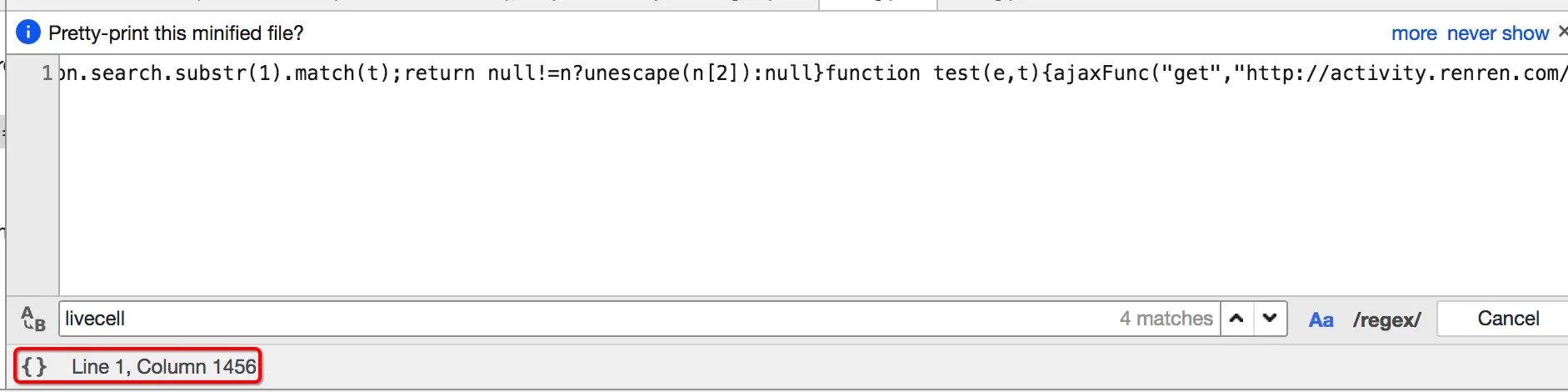 部分网站的按钮可能并没有绑定js事件监听,那么这个时候可以通过搜索请求中的关键字来找到js的位置,比如livecell