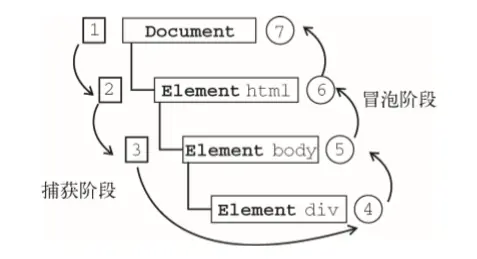 三个阶段:事件捕获阶段、处于目标阶段和事件冒泡阶段