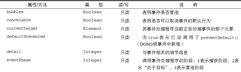 如果是在捕获阶 段调用的事件处理程序,那么 eventPhase 等于 1;如果事件处理程序处于目标对象上,则 event- Phase 等于 2;如果是在冒泡阶段调用的事件处理程序,eventPhase 等于 3