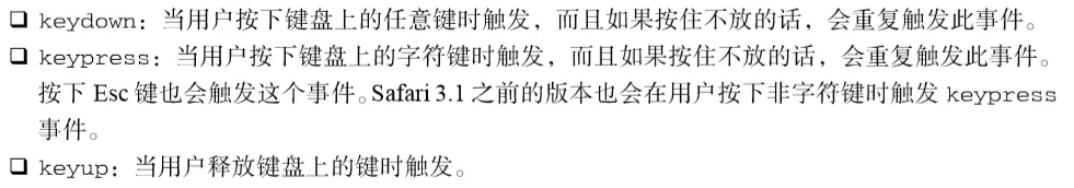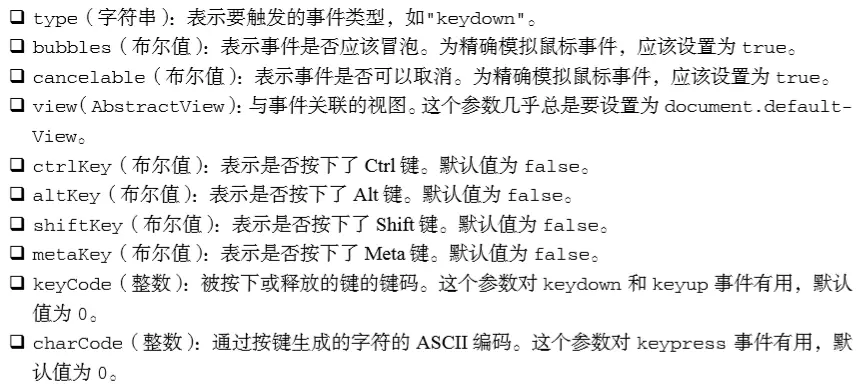 DOM3级规定,调用 createEvent()并传入"KeyboardEvent"就可以创建一个键盘事件。返回的 事件对象会包含一个 initKeyEvent()方法,这个方法接收下列参数