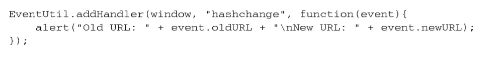 必须要把 hashchange 事件处理程序添加给 window 对象,然后 URL参数列表只要变化就会调用 它。此时的 event 对象应该额外包含两个属性:oldURL 和 newURL。这两个属性分别保存着参数列表 变化前后的完整 URL