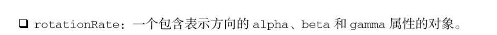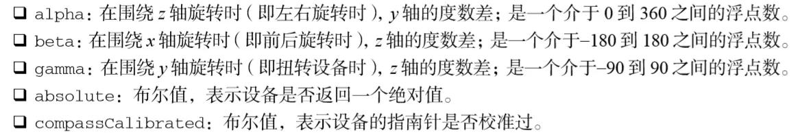 DeviceOrientation Event规范定义的 deviceorientation 事件与 MozOrientation 事件类 似。它也是在加速计检测到设备方向变化时在 window 对象上触发,而且具有与 MozOrientation 事件 相同的支持限制。不过,deviceorientation 事件的意图是告诉开发人员设备在空间中朝向哪儿,而 不是如何移动