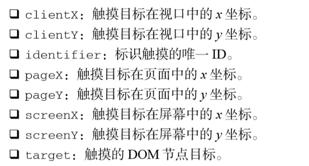 每个触摸事件的 event 对象都提供了在鼠标事件中常见的属性: bubbles、cancelable、view、clientX、clientY、screenX、screenY、detail、altKey、shiftKey、 ctrlKey 和 metaKey。